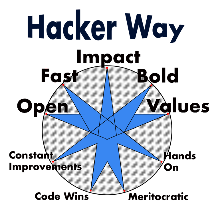 There may also be applications of the Hacker Way to your personal life and code of conduct. Do you want your life to have an impact on the world? To have meaning? Do you want your life to embody ethical values that you are proud of? Do you share, or are you closed off, an iconoclastic island? Are you open to change, no matter how fast it may come? Can you take action, make decisions? Can you quickly implement your decisions? Are you efficient and productive? Do you dare to be bold, or just follow timid conventions of old?