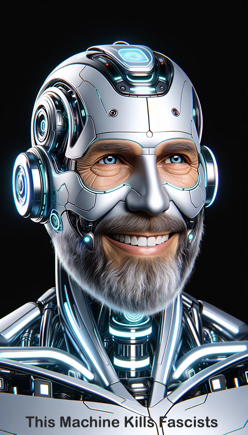 For another beta test of the Panel of AI Experts for Lawyers a commencement speech by Bruce Schneier, with the interesting title, On How AI May Change, was uploaded to the GPT for analysis and discussion. Bruce Schneier, whose blog publicity photo is shown right, is a world renowned, yet self-effacing, mild mannered cybersecurity expert at Harvard University (and elsewhere). He identifies as a public-interest technologist who works at the intersection of security, technology, and people. He’s been writing about security issues on his blog – Schneier on Security since 2004 and in his monthly newsletter since 1998. He is a fellow and lecturer on Cybersecurity Policy at Harvard’s Kennedy School, a board member of EFF, and the Chief of Security Architecture at Inrupt, Inc. By the way, zoom of his blog photo reveals that the computer sticker says: “This Machine Kills Fascists.”